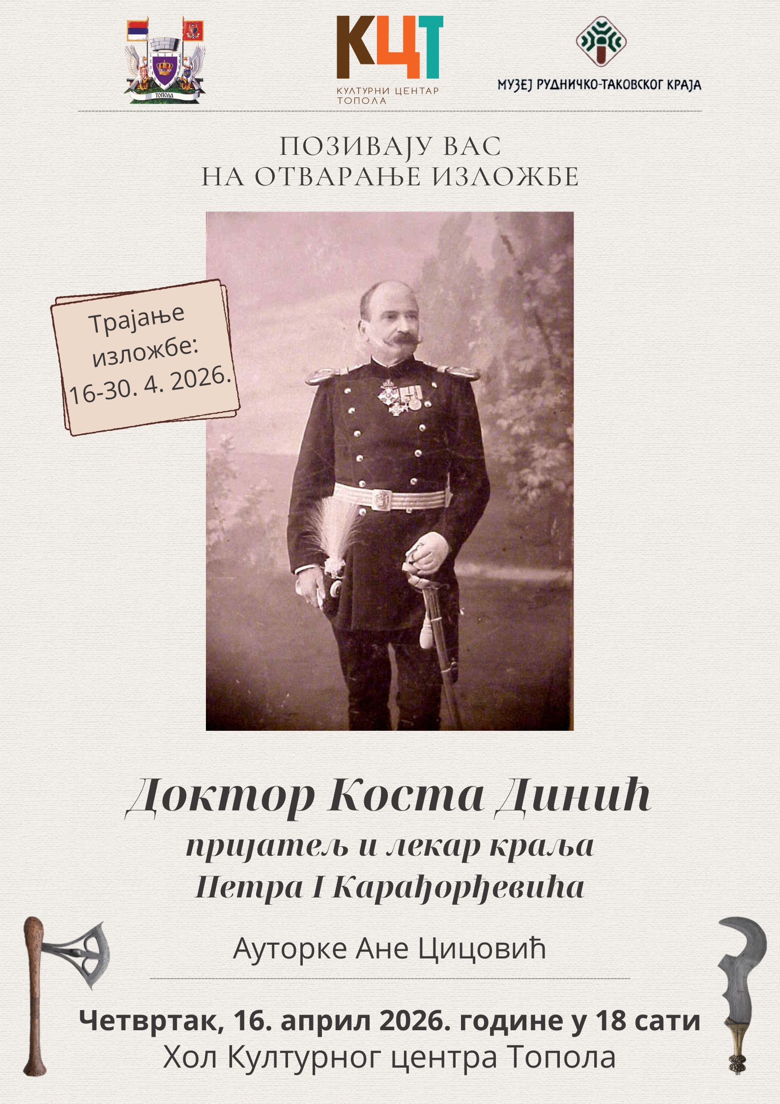 Културни центар Топола у сарадњи са Музејом рудничко-таковског краја организује отварање изложбе посвећене изузетном животном путу др Косте Динића – првог српског истраживача и етнографа тропске Африке, лекара, рођака и блиског пријатеља и повереника краља Петра I Карађорђевића.